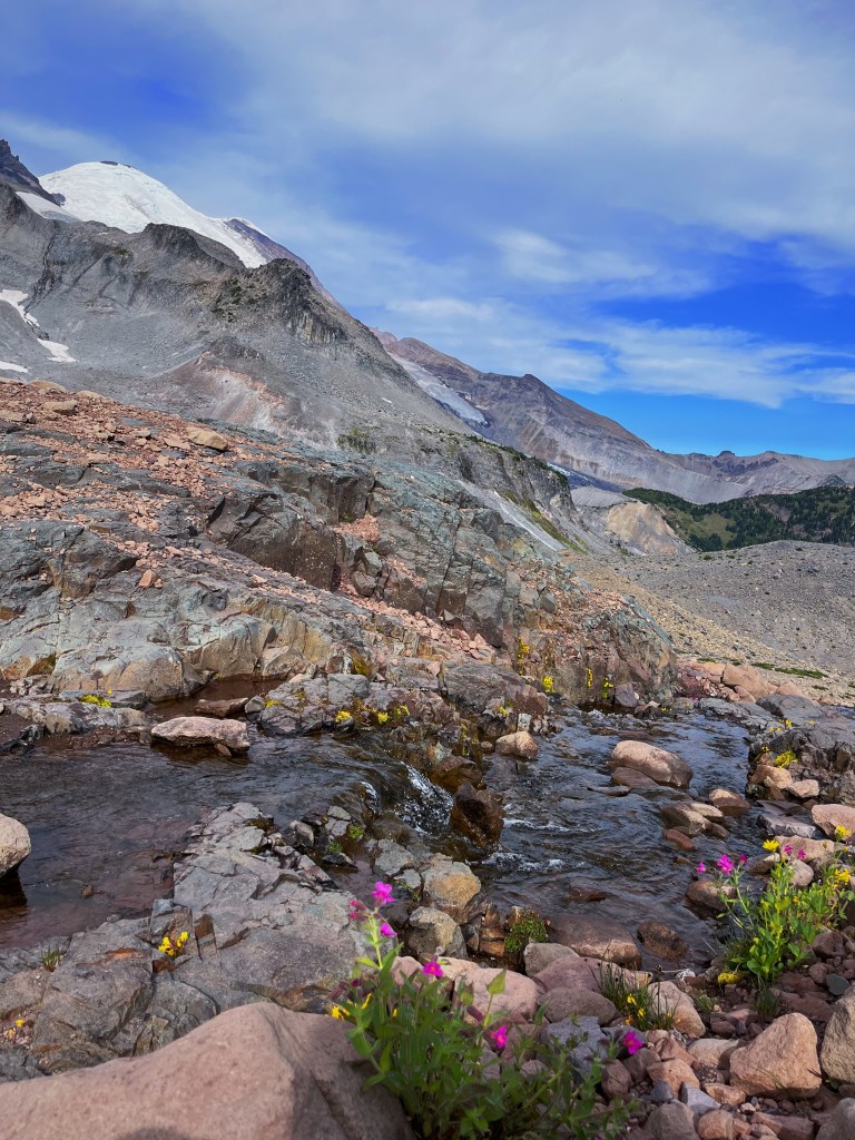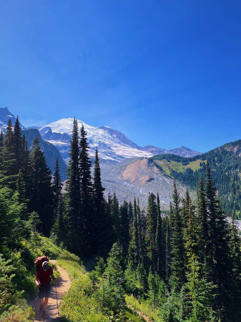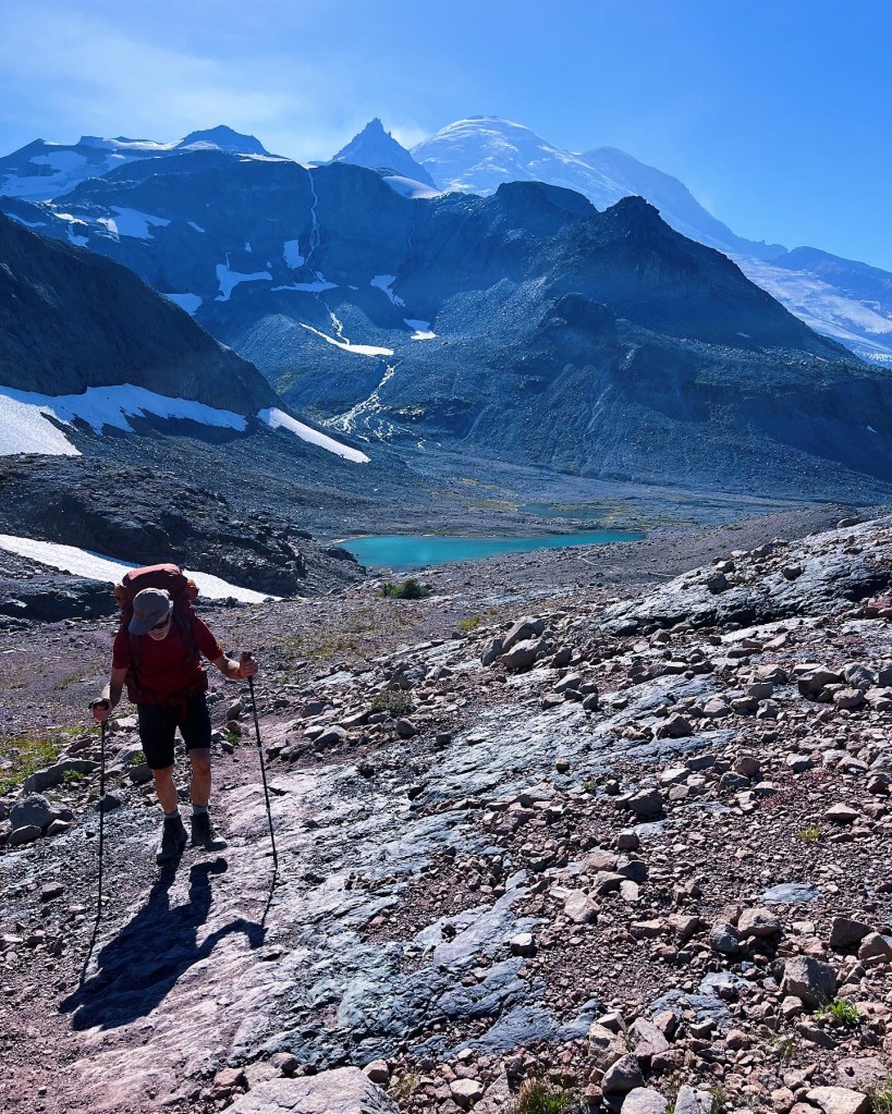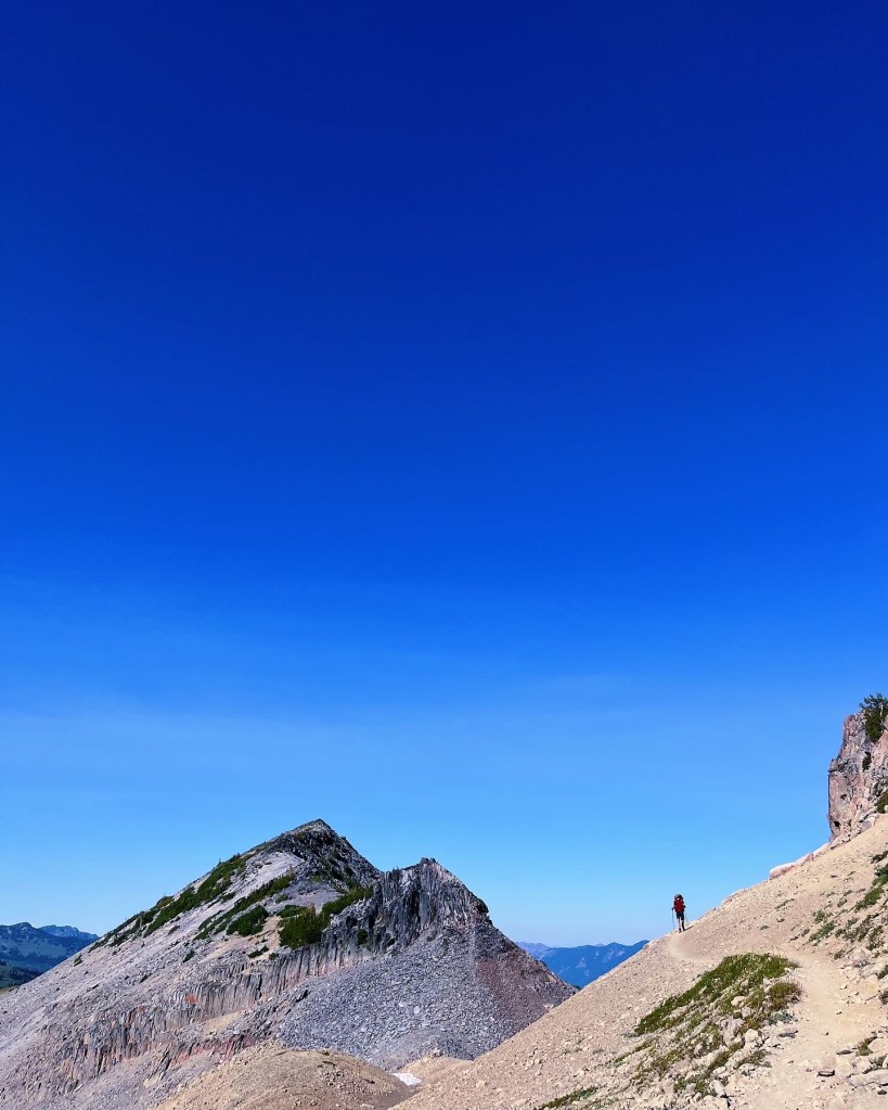 Brilliant blue August skies and a stubborn remnant of glacier clinging to the volcanic shoulders of Mt Rainier. Perfect backpack trip off the beaten path. [photos by Jillian]