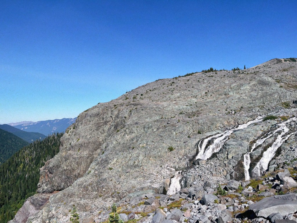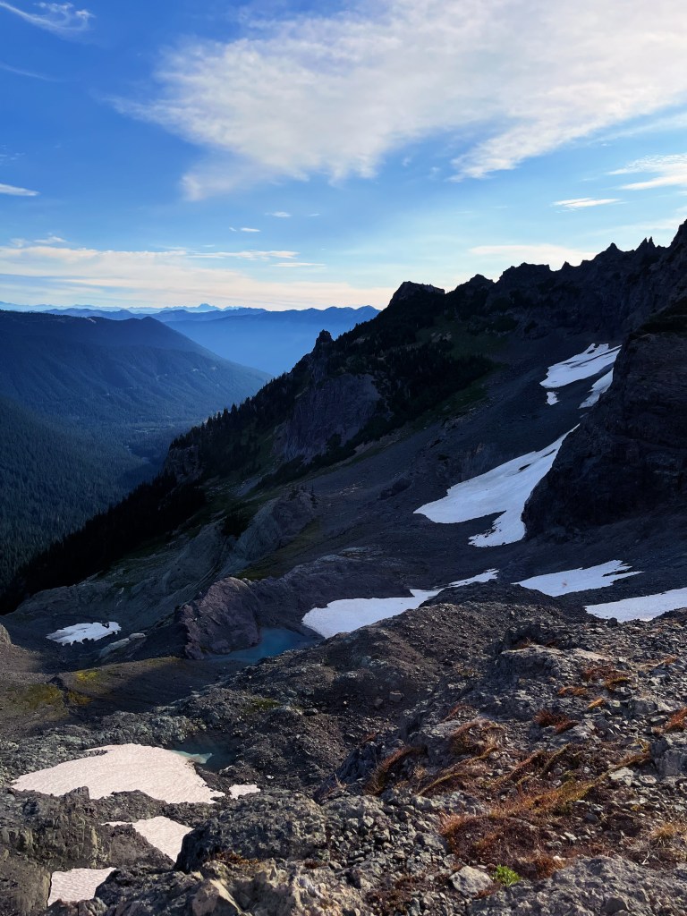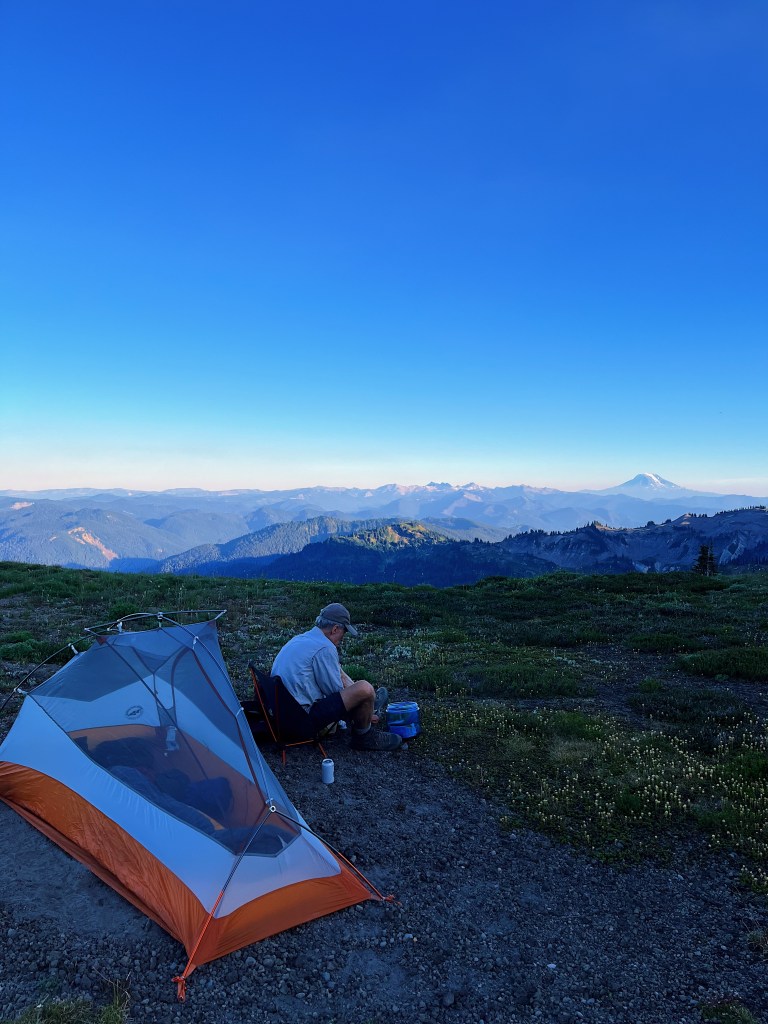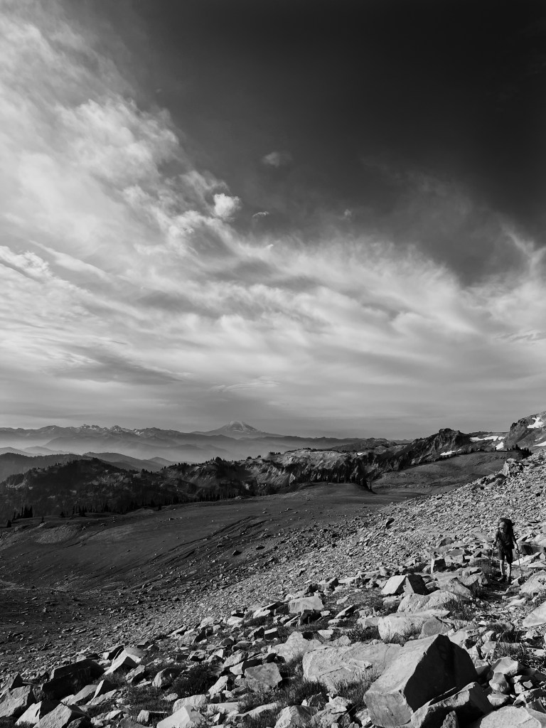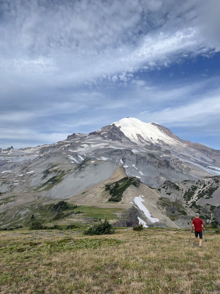 Brilliant blue August skies and a stubborn remnant of glacier clinging to the volcanic shoulders of Mt Rainier. Perfect backpack trip off the beaten path. [photos by Jillian]