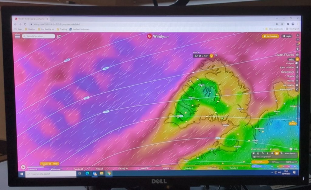 50-knots, gusting to 65 in the Daenmark Straight, so we had to lie to shelter in a fjord in Iceland, but we still wanted to cross over to Greenland, so the captain waited for the winds to subside to a mere 45 knots, gusting to 55, then headed out into the straight for the 240-mile open water crossing. Yikes!