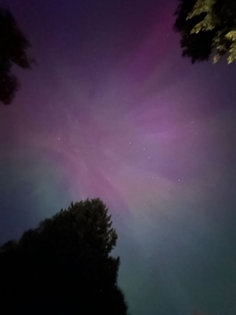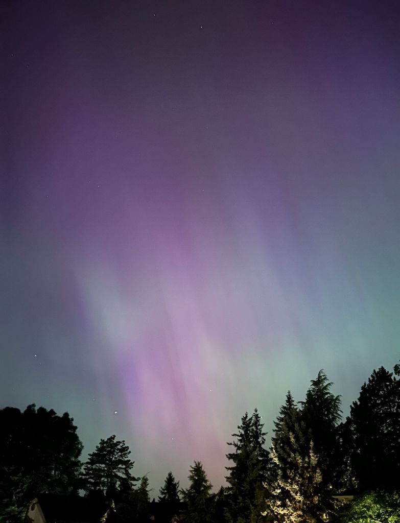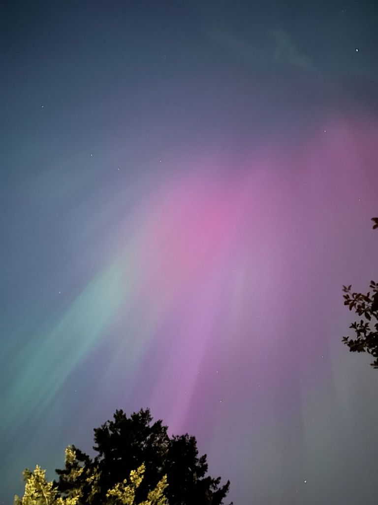 The once-in-a-lifetime Solar Wind overwhelmed and outshined the city lights. These are untouched photos from the phone as we stood in our front yard: